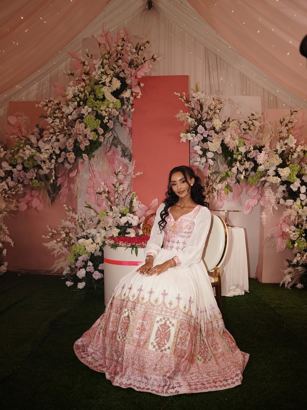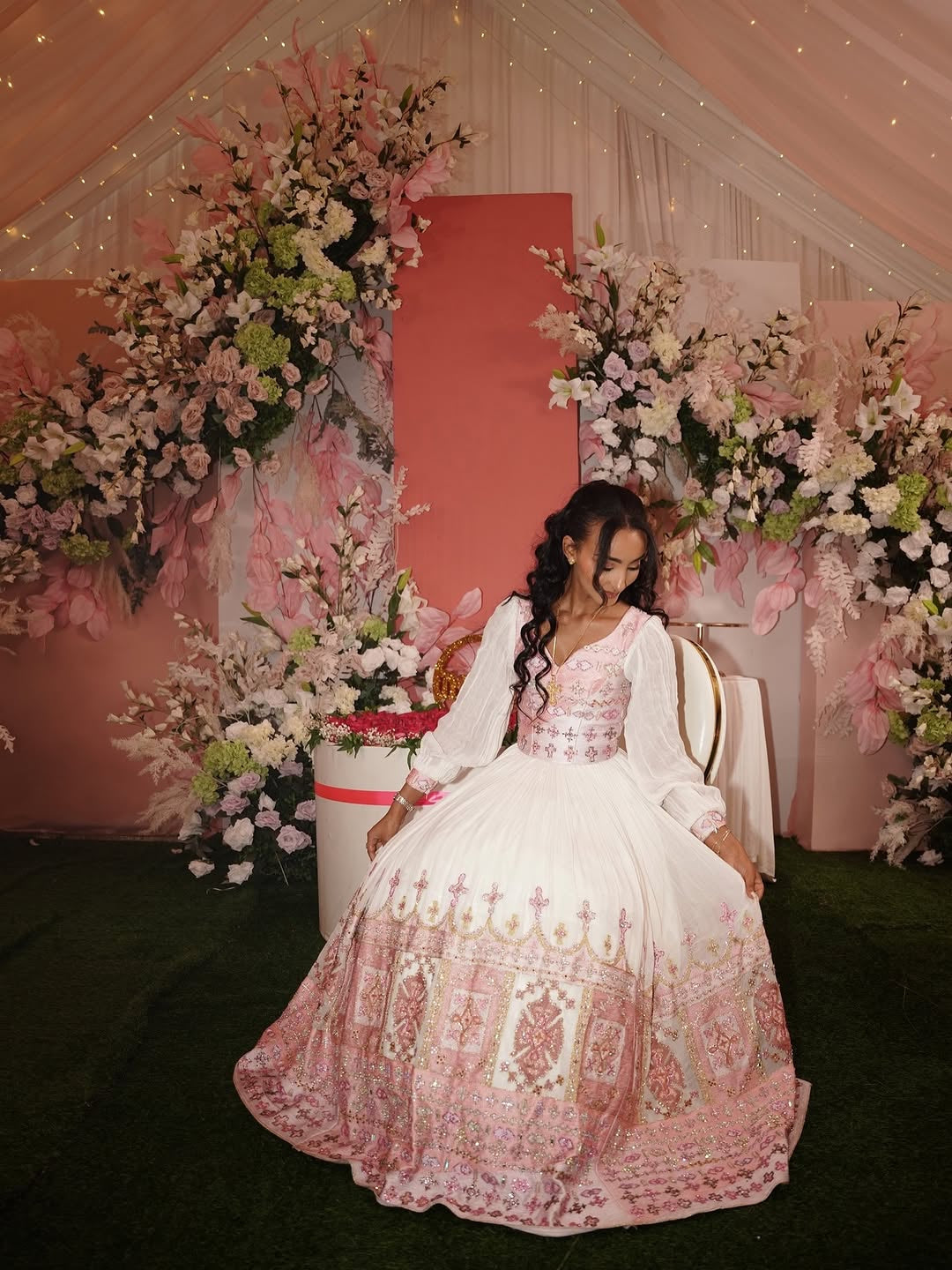 ሐበሻ የጋብቻ ቀሚስ – ነጭ እና ሮዝ ክር የተዋበ የጥጥ ቀሚስ