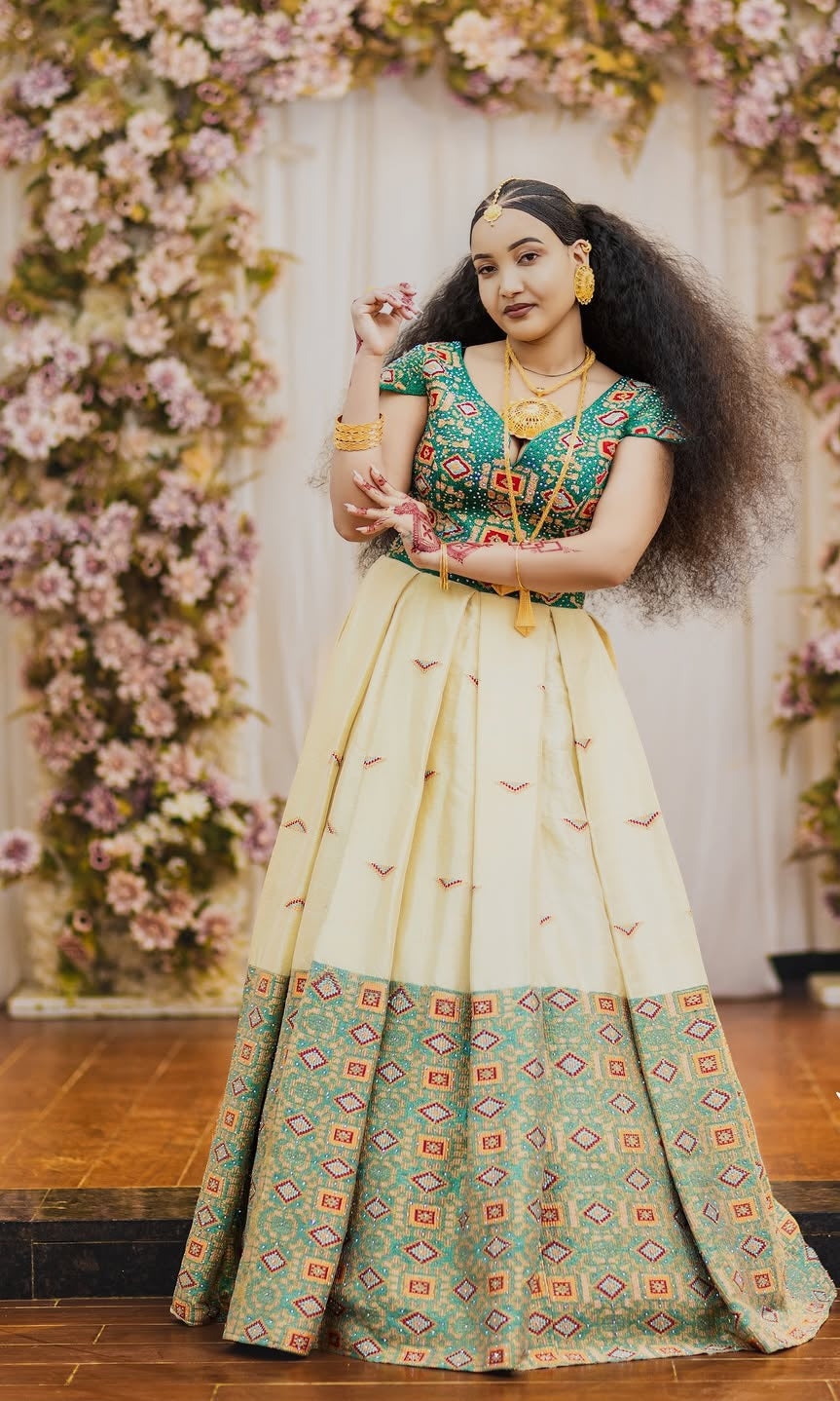 ይህ ልዩ አረንጓዴ የሙሽራ ቀሚስ ለባህላዊ ሠርግ፣ ለመልስ ወይም ለእጮኝነት ተብሎ በልዩ የወርቅና አረንጓዴ ጥልፍ ያሸበረቀ ለሙሽሮች ክብር የሚሰጥ ልዩ የሐበሻ ልብስ ነው። የፈለጉትን የሀገር ባህል ልብስ በመረጡት ዲዛይን ቆንጆ ና ጥንካሬን አላብሰን የሀገራችን ምርት የሆነውን ሽመና ባማረ ዲዛይን ሰርተን እናለብስዎታለን ❤️ከሀገር ውጭ ላላችሁ በDHL እና FedEx እንልካለን እንዲሁም በhabeshaoutlets.com፣ የመረጡትን ዲዛይን ይላኩልን.