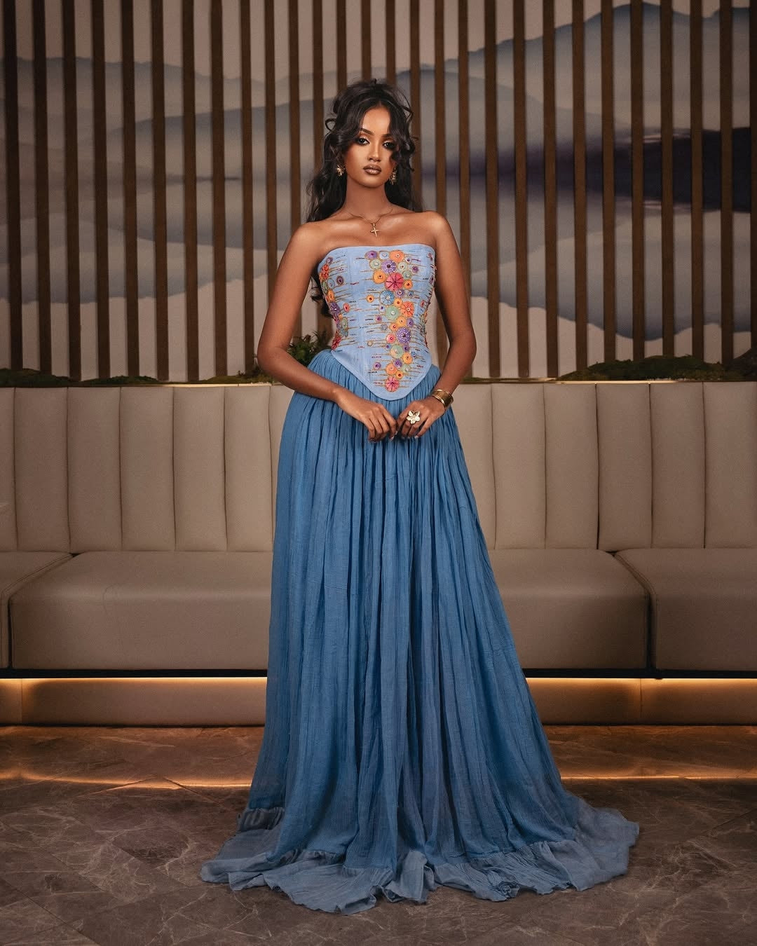 The strapless corset bodice forms the centerpiece of the design. Carefully structured to shape and support the upper body, the bodice is decorated with vibrant hand-embroidered Tilf patterns, a traditional Ethiopian embroidery technique known for its geometric motifs and artistic detailing. The embroidery features lively accents of orange, purple, and yellow that contrast beautifully against the soft sky blue background, giving the dress a colorful and artistic finish.