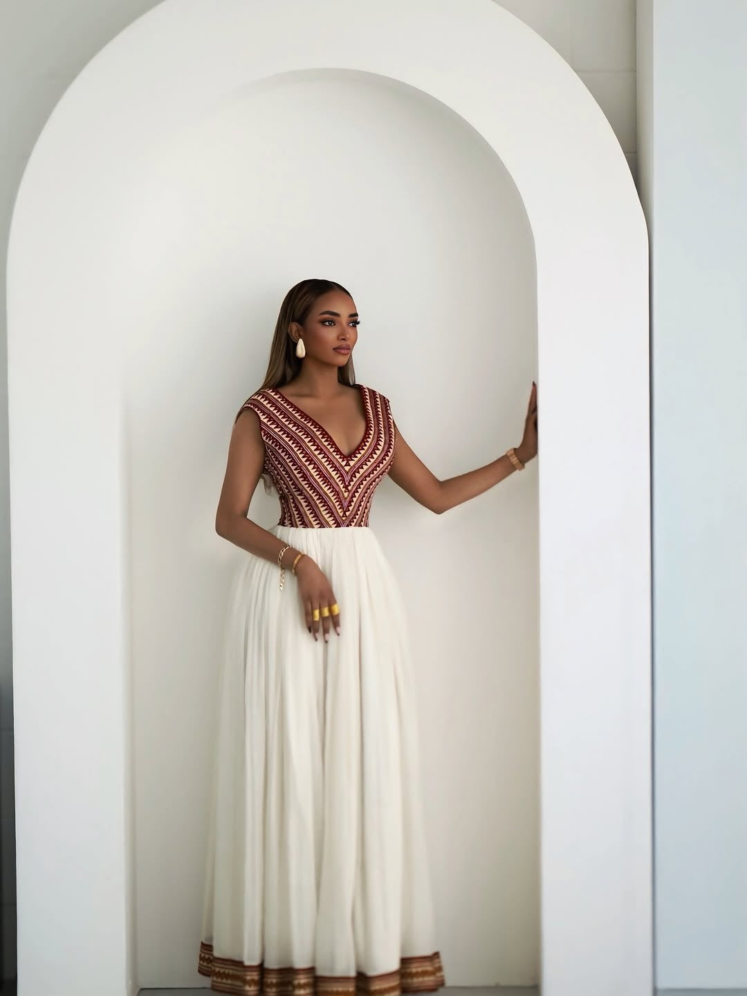 Introducing a sophisticated and timeless addition to our collection:Harmony Habesha Kemis – Deep Red Modern Elegance Ethiopian Dress by Tsehaye Mehari. This Ethiopian dress is defined by its elegant color contrast, making it perfect for formal events, church, or holiday celebrations. The main body of the dress is made from pure, soft white handwoven cotton, offering breathability and a beautiful, natural drape.