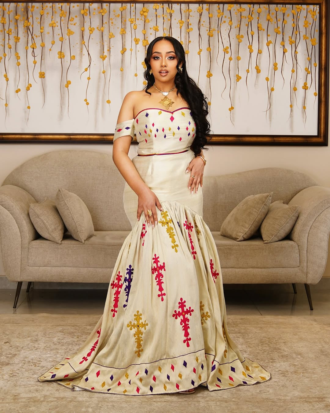 Discover the breathtaking elegance of this Ivory Mermaid Habesha Kemis, a glamorous modern take on the classic Ethiopian traditional dress by Tesfaye Mehari. This gown is meticulously structured to create a captivating off-the-shoulder neckline and a figure-flattering mermaid silhouette that flares gracefully from the knee. It’s an unforgettable piece perfect for an Ethiopian wedding, engagement celebration, or high-profile cultural gala.