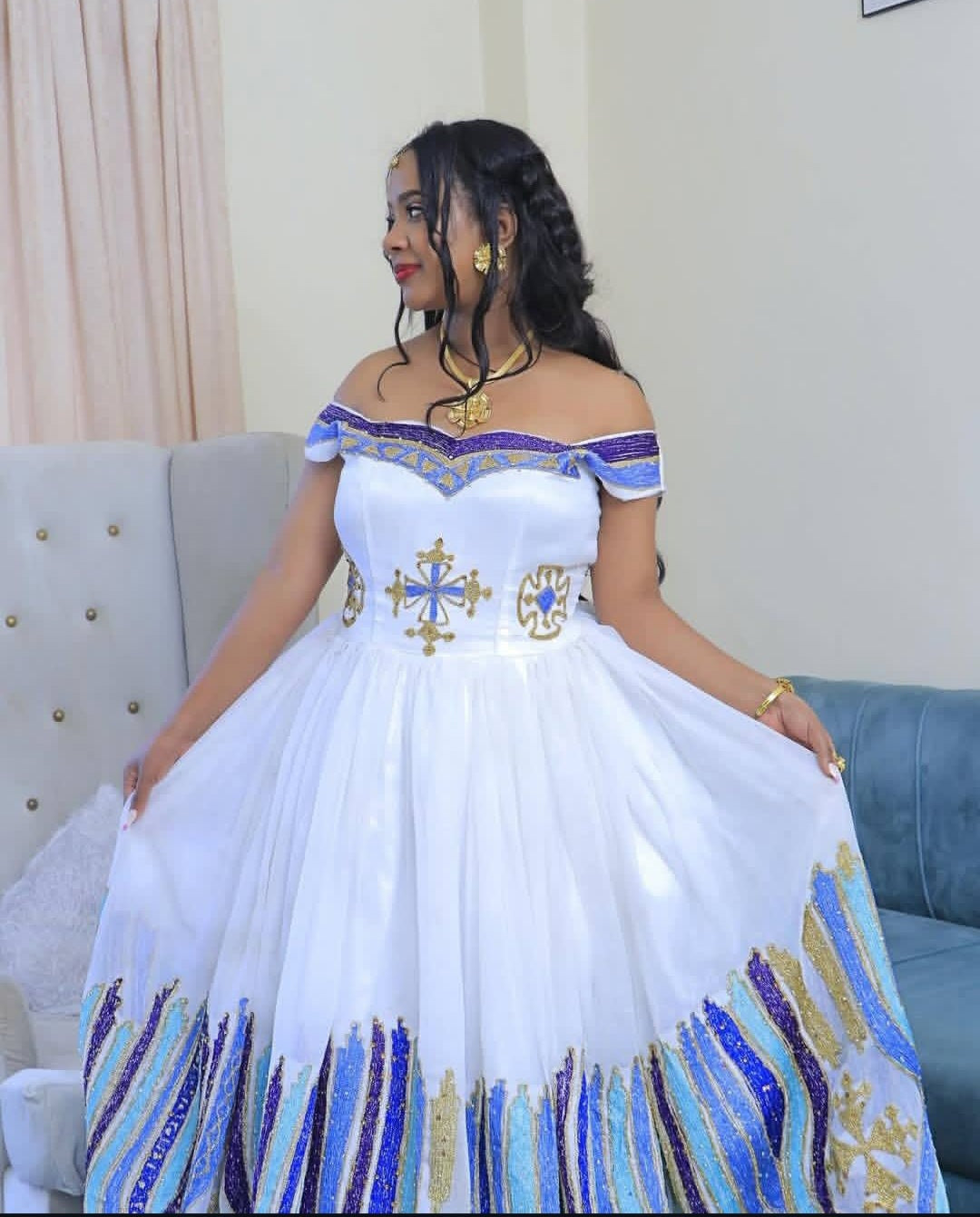 Adorn yourself in this breathtaking Ethiopian wedding dress, a symbol of grace and cultural pride. This Habesha kemis is a modern twist on a classic, featuring an elegant off-the-shoulder neckline that adds a touch of sophistication. The dress is made from soft, flowing cotton, with a full, voluminous skirt perfect for a bride's special day. The lower half of the dress is decorated with stunning royal purple tibeb, showcasing intricate patterns that evoke a sense of regality and tradition. A large, ornate cross design at the waist adds a powerful spiritual and cultural element. This dress is perfect for weddings, engagement ceremonies, or any formal event where you want to make a statement. We offer custom sizing and free worldwide shipping, making it easy for those in the US, UK, EU, and beyond to receive a piece of their heritage. Shop now and embrace your roots with this exceptional dress.